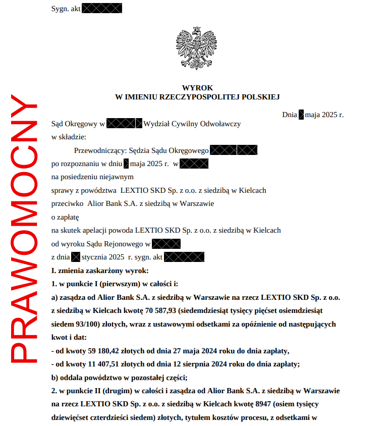 W jednej z naszych spraw SKD Warszawa przeciwko Alior Bank S.A. (Sąd Okręgowy w Warszawie), gdzie kwota do zwrotu wyniosła 70 587,93 zł, osiągnęliśmy imponujący rezultat: